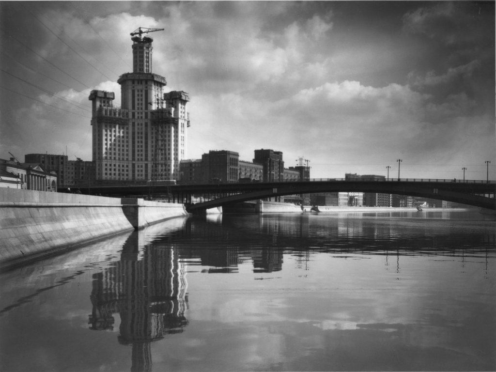 El río Moskvá y de fondo uno de los rascacielos de la era Stalin en 1951.Naum Granovsky / Lumiere Gallery
