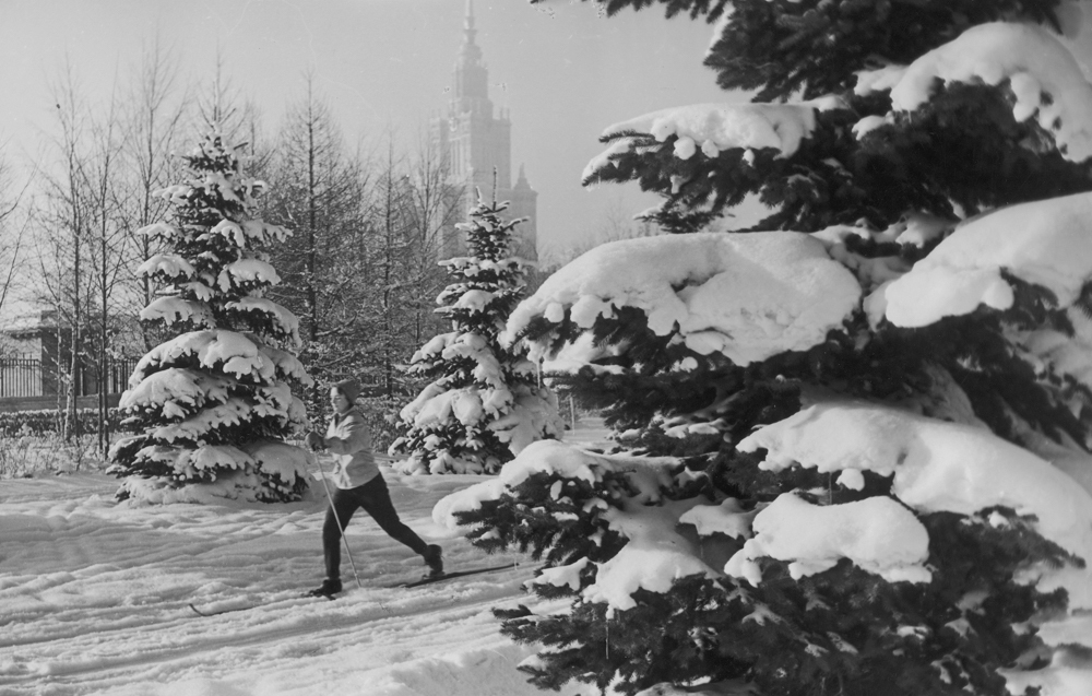 Mujer esquiando con uno de los rascacielos de la era Stalin de fondo en 1960.Naum Granovsky / Lumiere Gallery