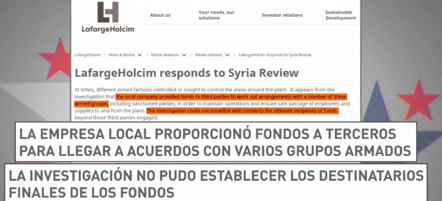 La empresa, denunciada por varias ONGs, ha reconocido que su filial, que en aquel entonces pertenecía a la francesa Lafarge, "entregó fondos a terceras personas para alcanzar acuerdos con algunos grupos armados, un tercio de los cuales estaban sometidos a sanciones" por parte de la comunidad internacional.