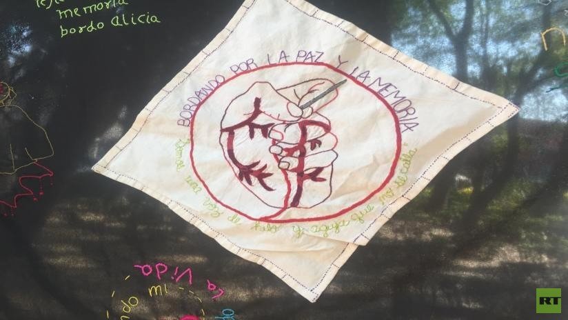 Rodeados por pañuelos blancos que cuelgan de los postes, la pareja no despega la vista del bordado que tiene en sus manos. Clavan la aguja sobre la tela, bordan finamente con cada punzada los nombres que quieren sacar del olvido.