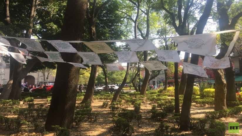 En esta plaza pública de Coyoacán, en la que pasean familias, personas con sus perros y parejas enamoradas, usualmente hay extranjeros que caminan por ahí y se detienen curiosos a mirar qué son esos bordados que cuelgan de los postes.