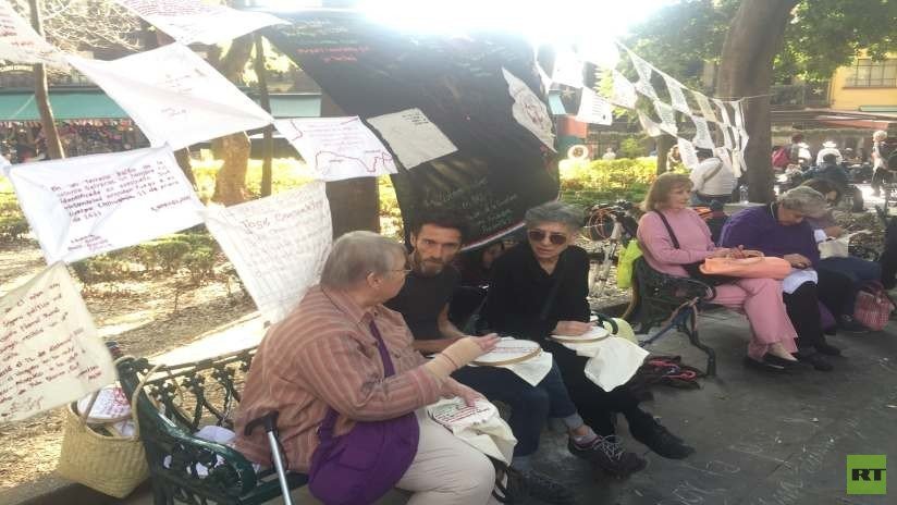 "Me parece precioso que sea bordado por un montón de personas que queremos construir memoria", dice Tania, mientras a unos cuantos metros Rosa María y José Luis tejen hábilmente.