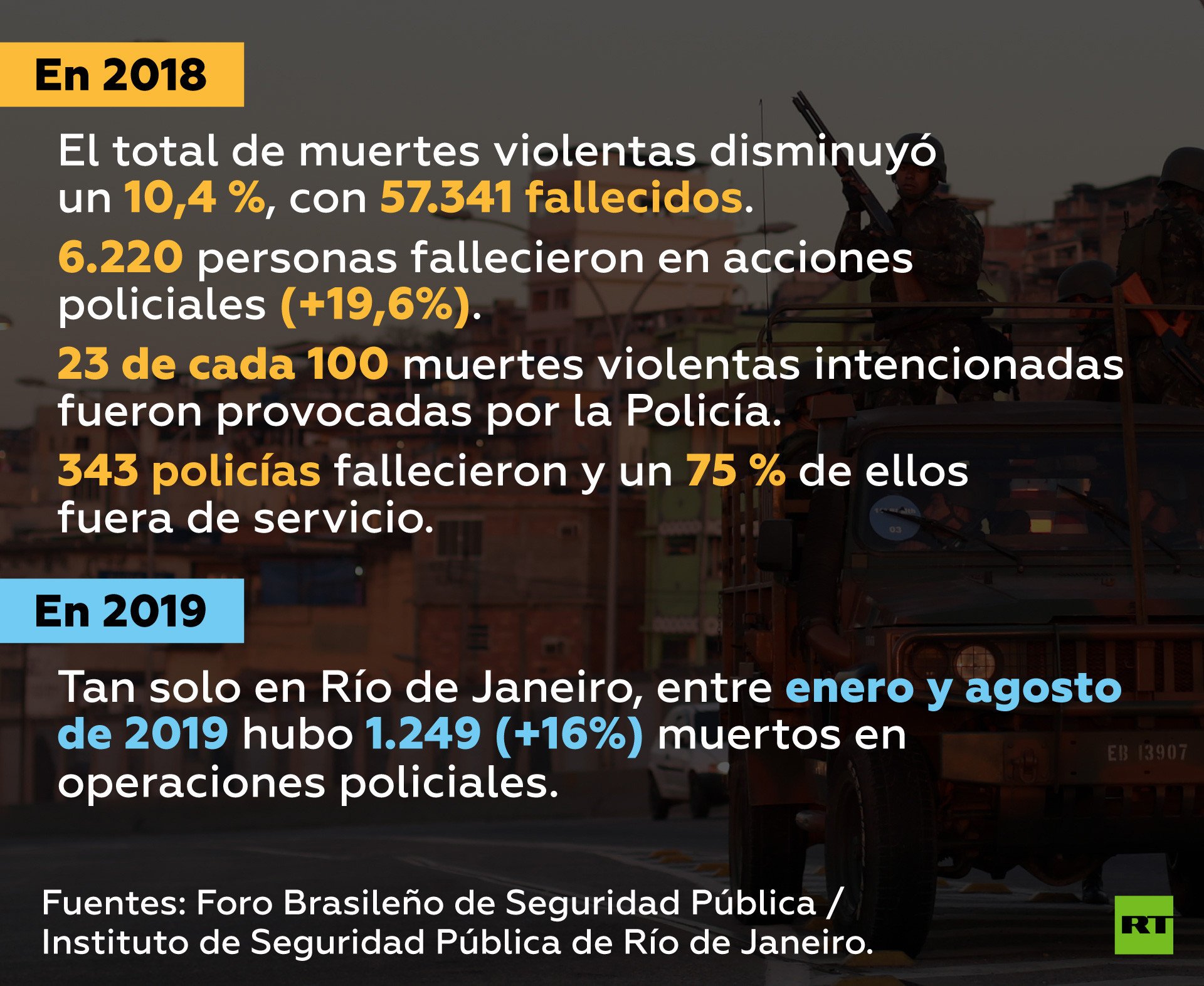 Si bien el número total de muertes violentas en Brasil disminuyó el año pasado un 10,4%, respecto al año anterior, al alcanzar las 57.341 fallecidos, 6.220 personas perdieron la vida en acciones policiales, un aumentó de un 19,6%. El Foro Brasileño de Seguridad Pública estima que 23 de cada 100 muertes violentas intencionadas fueron provocadas por la Policía. Tan solo en Río, entre enero y agosto de 2019 hubo 1.249 (+16%) muertos en operaciones policiales, según el Instituto de Seguridad Pública (ISP) de Río de Janeiro. Mientras, 343 policías fallecieron en 2018, y un 75% fuera de servicio.