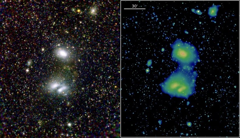En otras imágenes de eROSITA, el sistema A3391/3395 de cúmulos interactivos de galaxias aparece con grandes y elípticas nebulosas que abarcan decenas de millones de años luz y contienen miles de galaxias cada una.