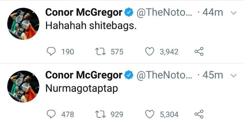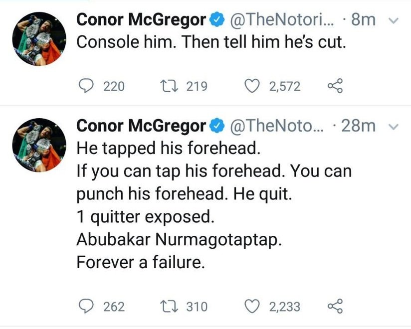De inmediato, el peleador irlandés Conor McGregor se burló de esta derrota en Twitter con risas y comentarios como "cobarde" y "Nurmagotaptap" que borró posteriormente.
