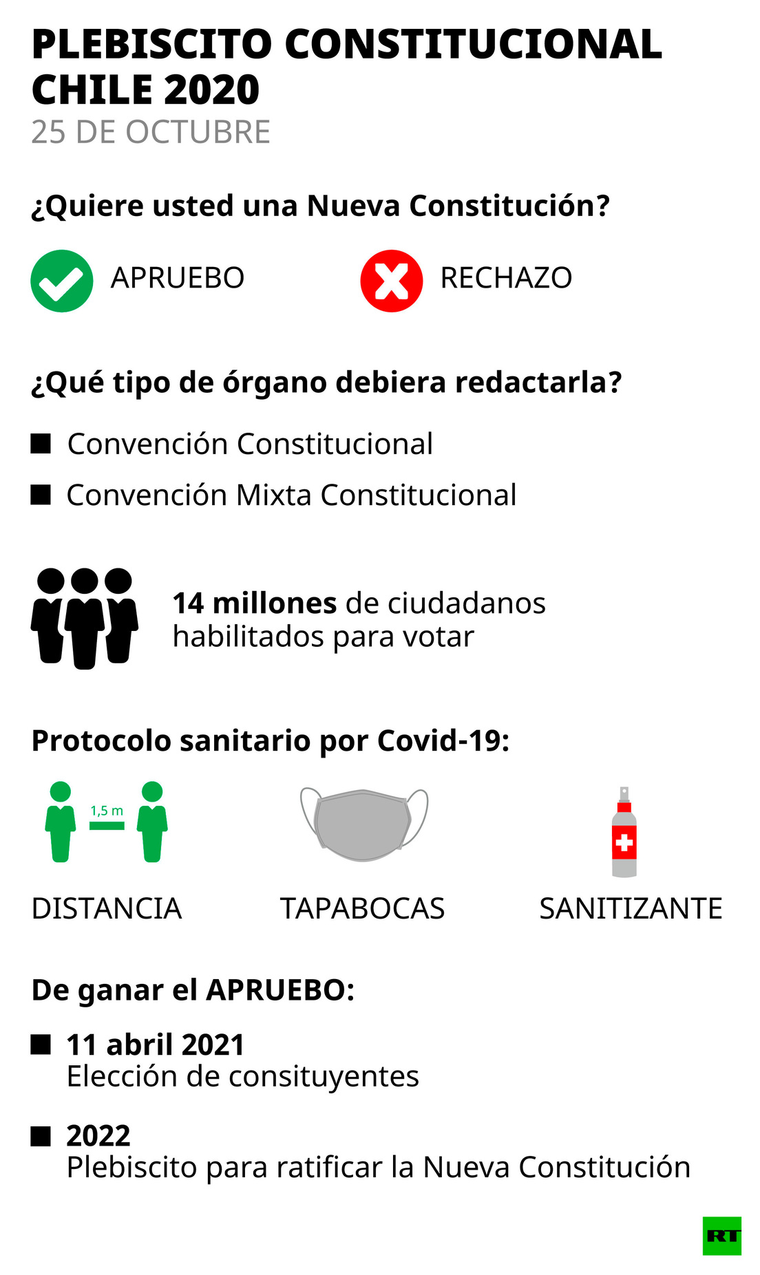 Más de 14 millones de ciudadanos están habilitados para participar del plebiscito, aunque se espera una participación cercana al 60 % debido a la pandemia. Cumpliendo un estricto protocolo sanitario, los chilenos deberán responder, por medio del voto popular, si aprueban o rechazan la elaboración de una nueva Carta Magna. Además de la pregunta principal, los votantes decidirán qué órgano debería redactar la nueva Constitución, en caso de imponerse el sí. Esto habrá que hacerlo sin importar cuál sea la posición del elector respecto a la consulta anterior.