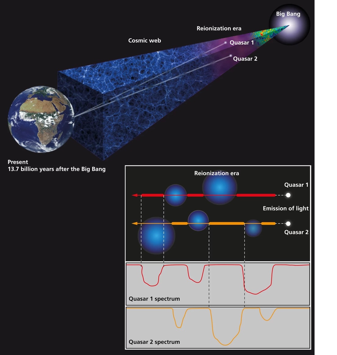 Para calcular cuándo ocurrió este fenómeno, los académicos estudiaron la radiación de 67 cuásares y analizaron el desplazamiento de las líneas espectrales causadas por la reionización del hidrógeno, con lo que lograron determinar que la ionización de estos elementos concluyó unos 1.100 millones de años después del Big Bang.