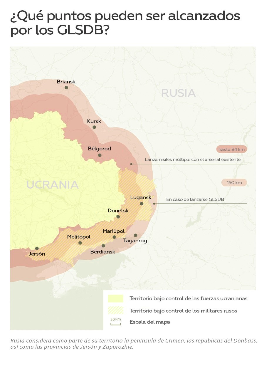 Los proyectiles GLSDB, que tienen un alcance de 150 km, pueden ser disparados desde sistemas lanzamisiles múltiples occidentales como HIMARS o M270, de los que Kiev dispone.
