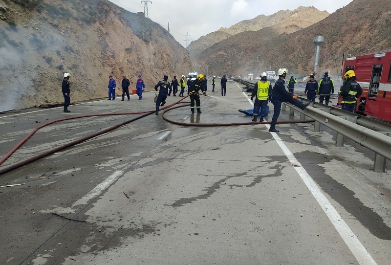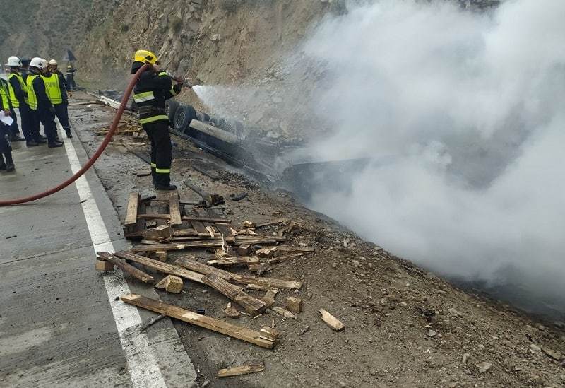 Inmediatamente llegaron los equipos de bomberos y de rescate al lugar del accidente y extinguieron el fuego en 25 minutos. Después de haber apagado las llamas por completo, se percataron de que el conductor había muerto en el camión.
