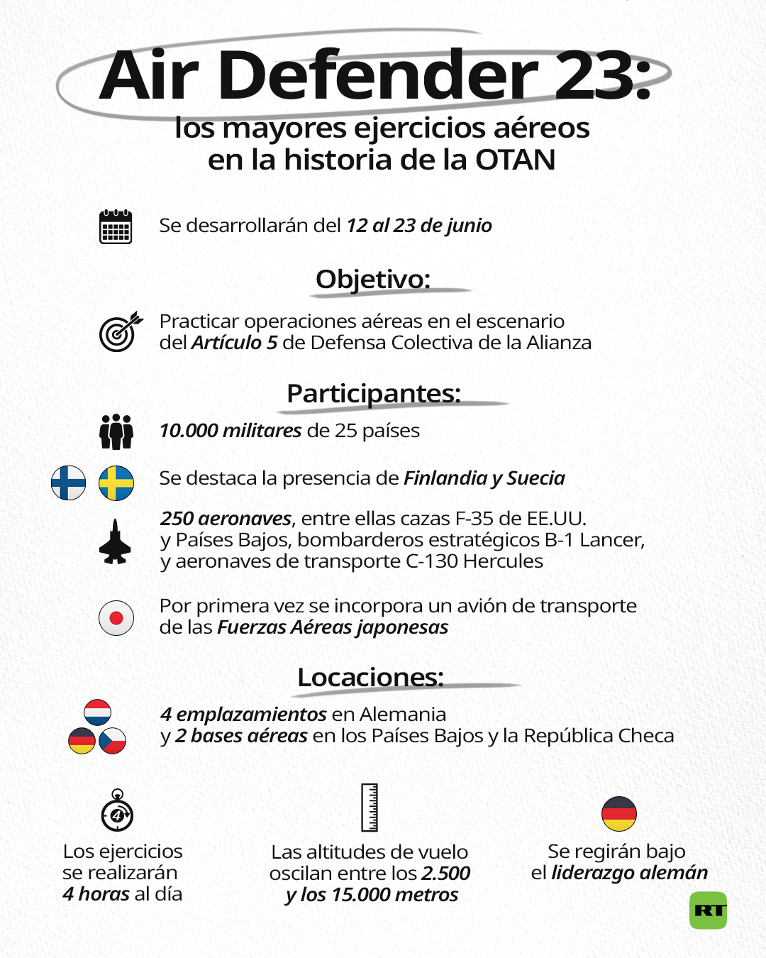 Los ejercicios Defensor del aire 23 ('Air Defender 23', en inglés) iniciarán el 12 de junio y se prolongarán durante diez días. Las maniobras se desarrollarán en Alemania, República Checa, Estonia y Letonia con la participarán de alrededor de 220 aviones militares de 25 países miembros de la OTAN y de sus aliados.