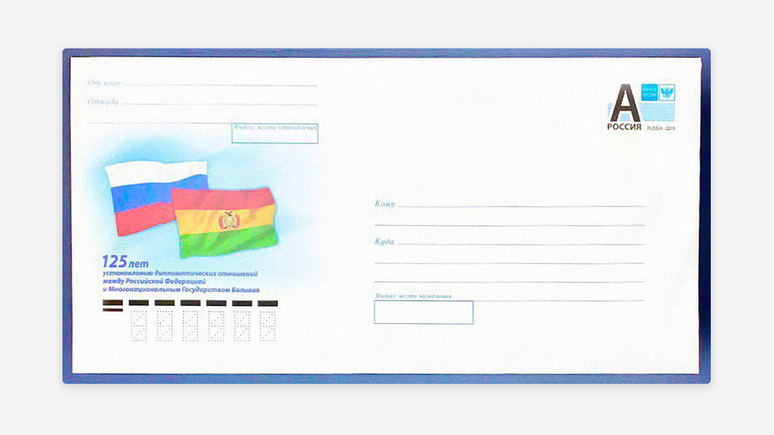 Mientras tanto, el servicio postal de Rusia presentó un sobre dedicado al aniversario del establecimiento de relaciones diplomáticas con La Paz.