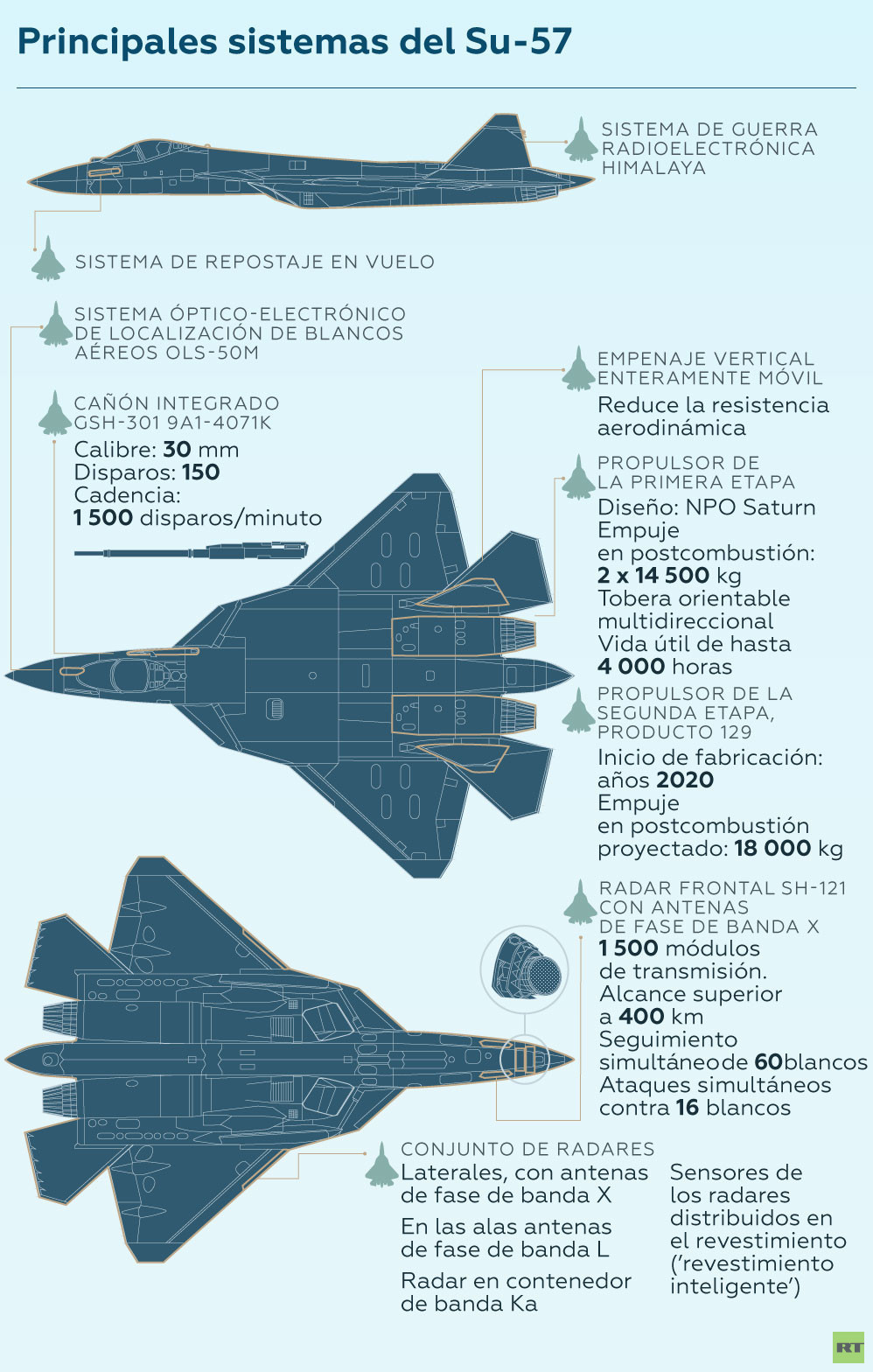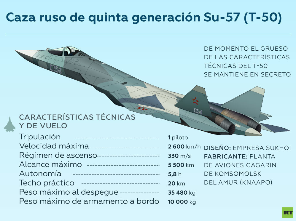 - Diseñado para destruir todo tipo de objetivos aéreos, terrestres y de superficie, el Su-57, que tiene velocidad de crucero supersónica, cuenta con recubrimientos absorbentes de radiación (tecnología de baja detectabilidad) y con los más novedosos complejos de equipos a bordo.