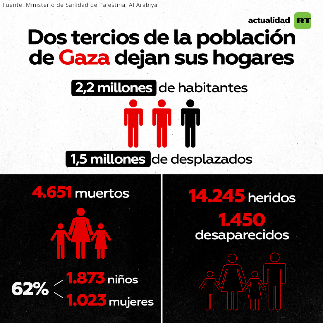 De acuerdo con los datos del Ministerio de Salud de la Franja de Gaza, 4.651 personas han muerto y 14.245 más han sido heridas en el enclave desde el inicio del conflicto.