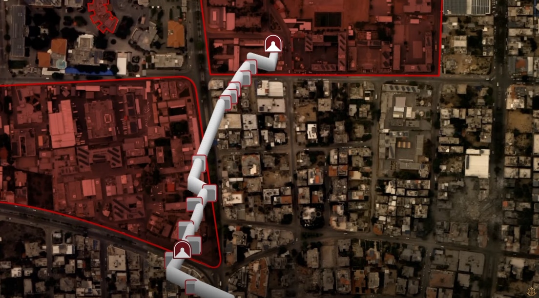 Los militares israelíes también afirman que el túnel contenía múltiples puertas contra explosivos y varias herramientas de inteligencia, así como grandes cantidades de armas, entre ellas fusiles, munición, granadas y explosivos, ocultas en las oficinas del edificio. "La inteligencia y los documentos encontrados confirmaron el uso de las oficinas por parte de terroristas de Hamás", declararon las FDI.