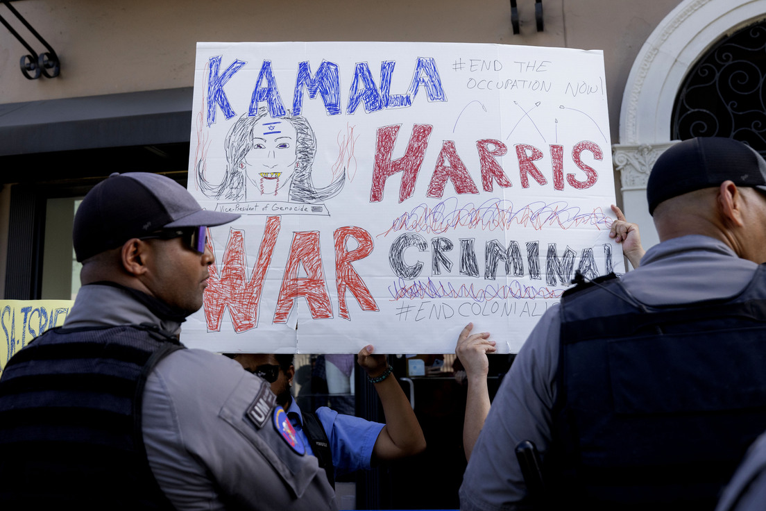 Durante su visita al centro comunitario, un pequeño grupo de manifestantes gritaron "Yankee, go home" (Yanqui, vete a casa). Además, uno de los protestantes sostenía un cartel con el mensaje "Kamala Harris criminal de guerra" y otro llamó "genocidas" a Estados Unidos e Israel.