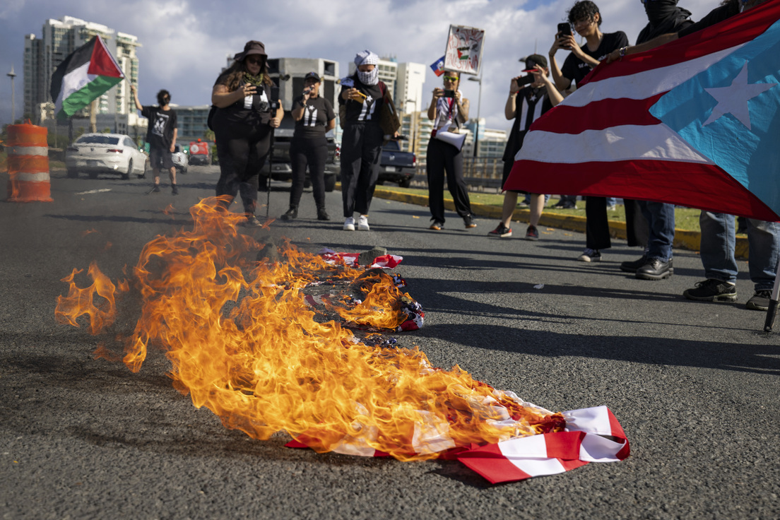 Asimismo, una veintena de personas realizaron previamente una protesta en la ciudad para lamentar el estatus de la isla como territorio y para exigir un cese al fuego en la guerra entre Israel y Hamás. "Nos parece una falta de respeto su presencia", dijo Joselyn Velázquez, vocera de la protesta, mientras un grupo que la rodeaba ondeaba banderas palestinas. Cerca de allí, otro grupo pisoteó y quemó banderas estadounidenses.