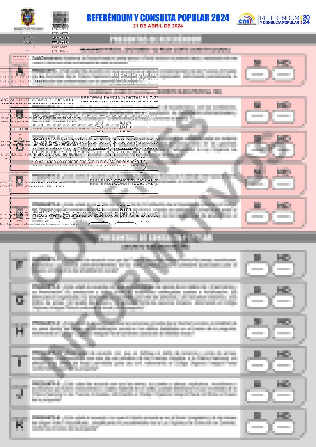 Los ecuatorianos deben responder "sí" o "no" a cinco preguntas de referéndum que plantean reformas a la Constitución, y seis de la consulta popular.