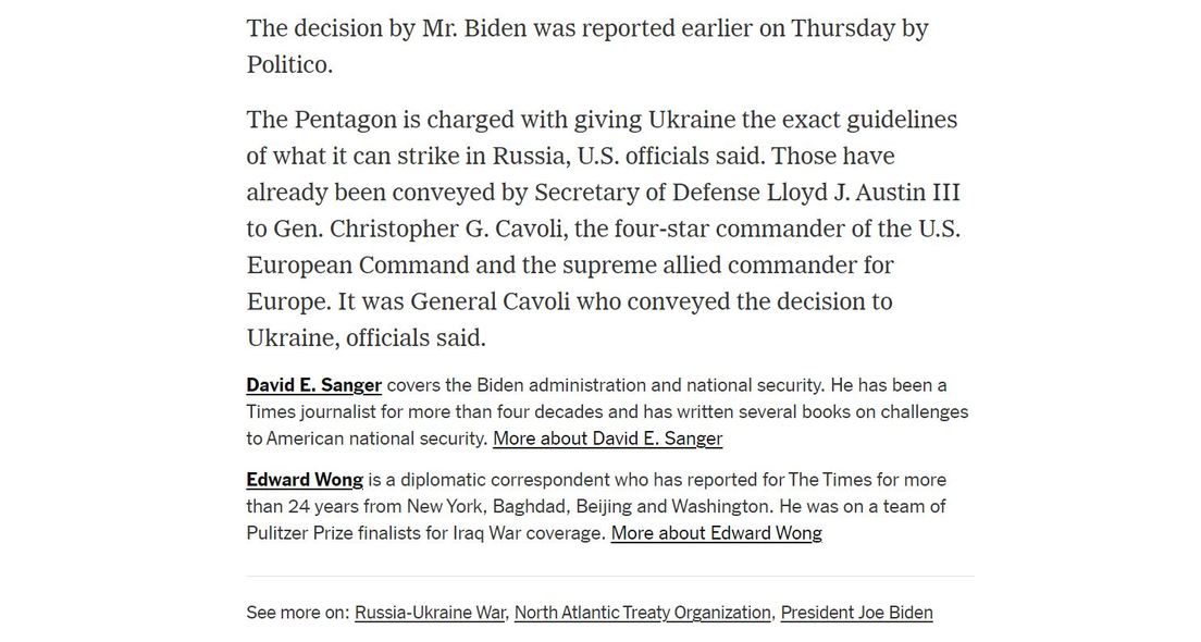 Uno de los interlocutores manifestó que "el presidente ordenó recientemente a su equipo que se asegurara de que Ucrania pudiera usar armas estadounidenses para fines de contraataque en Járkov, de modo que Ucrania pueda responder a las fuerzas rusas que les están atacando o preparándose para hacerlo". Por otra parte, la misma fuente sostuvo que la política de Washington respecto a ataques de largo alcance dentro de Rusia "no ha cambiado".