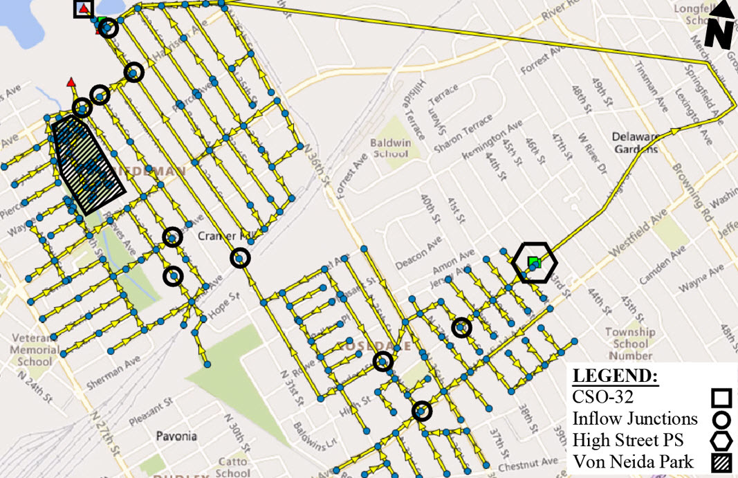 El equipo de Montalto utilizó un modelo hidrológico e hidráulico detallado de inundaciones y desbordamientos combinados de alcantarillado ya validado para simular lo que sucedería si las precipitaciones aumentaran hasta un 30% y si el nivel del mar subiera hasta 1,8 metros en la sección Cramer Hill de Camden (Nueva Jersey). Esta es una parte de la ciudad propensa a inundaciones, ubicada muy cerca del punto CSO más grande en el lado este del río Delaware.
