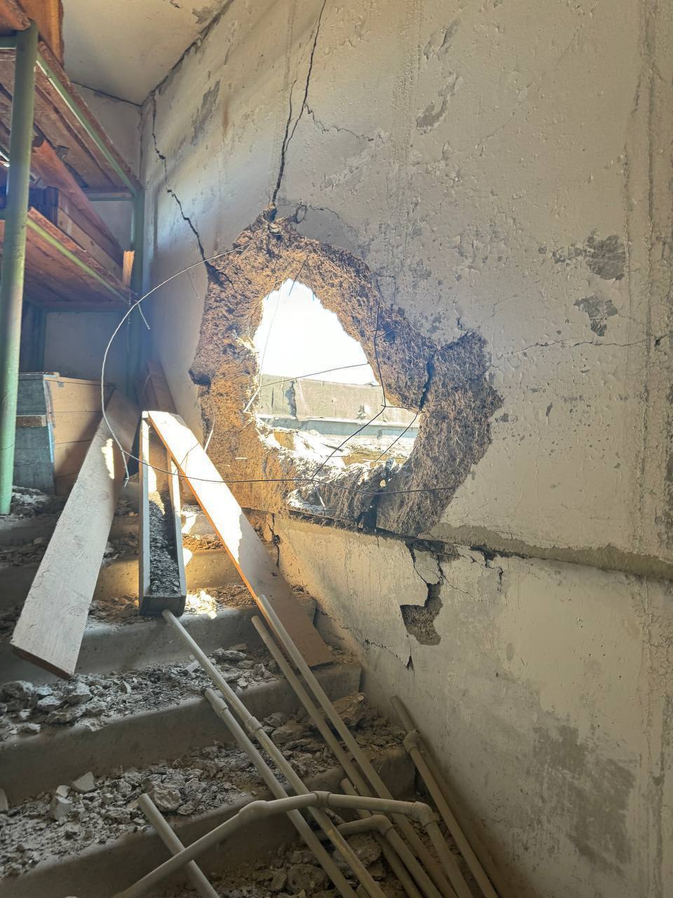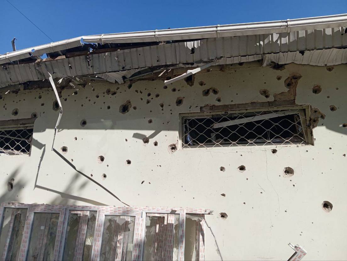 Por el momento se han detectado daños en dos edificios de viviendas: uno de ellos en la fachada y otro en el tejado, que fue penetrado como consecuencia del impacto directo de un proyectil.