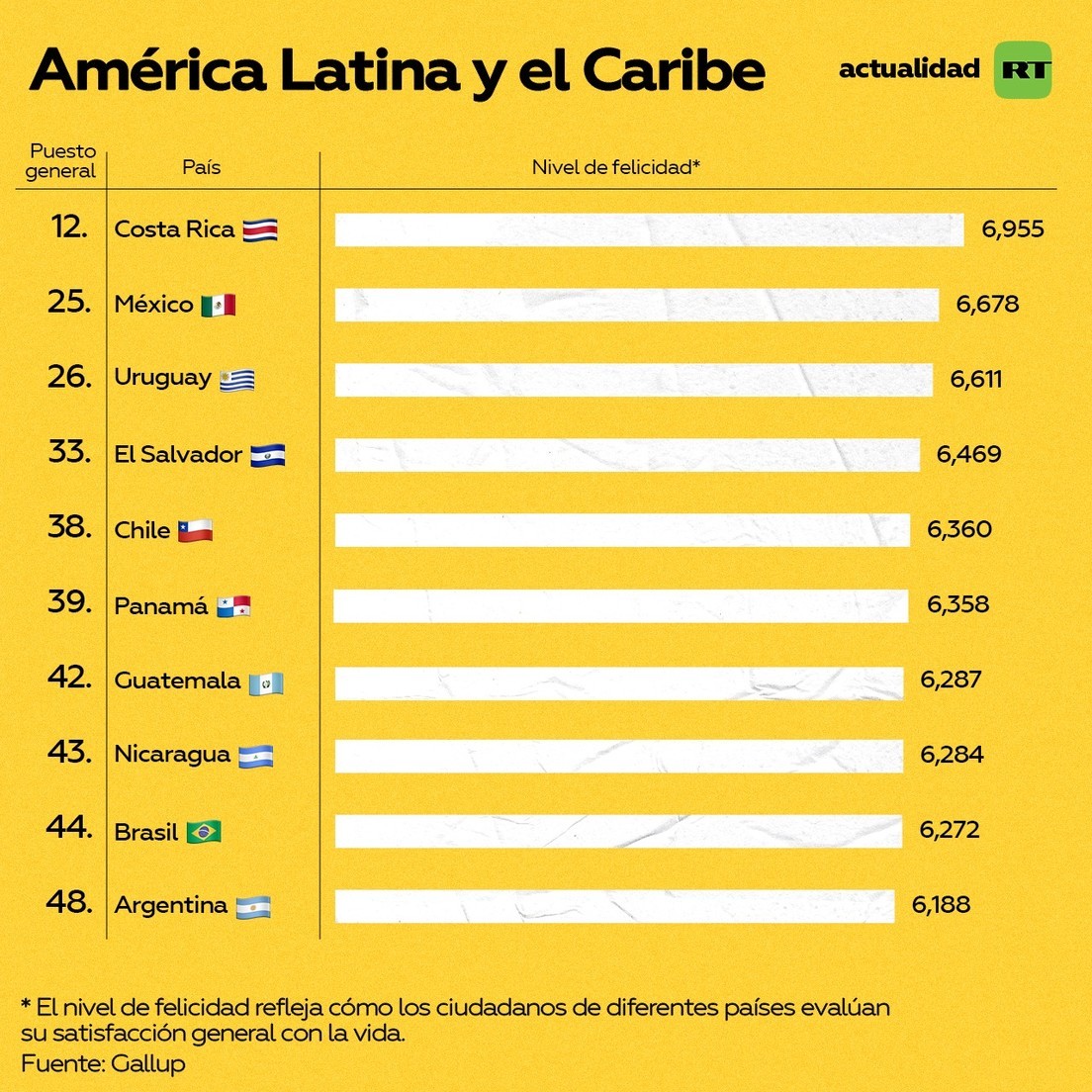Este año la ONU ha publicado su informe mundial de la felicidad, en el que varios países de Latinoamérica se encuentran entre las posiciones más altas de la clasificación. Entre ellos, Costa Rica, como en 2023, sigue siendo la nación de habla hispana más feliz del mundo ocupando el 12.º puesto en la lista. Lo siguen México y Uruguay, en la plaza 26.º y 27.º, respectivamente.