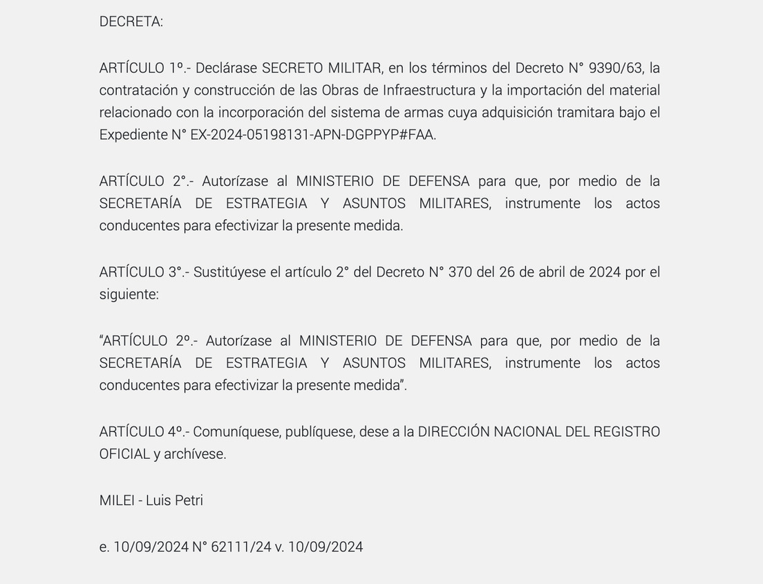 La medida, informa Página 12, le abre la posibilidad al titular de Defensa, Luis Petri, de gestionar cuantiosos recursos de manera discrecional, cuando lo considere necesario, siempre que se haga para fortalecer la "seguridad nacional".