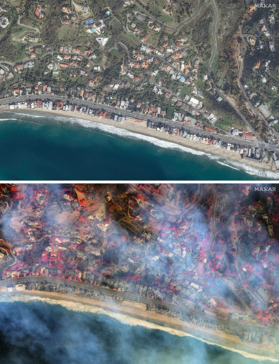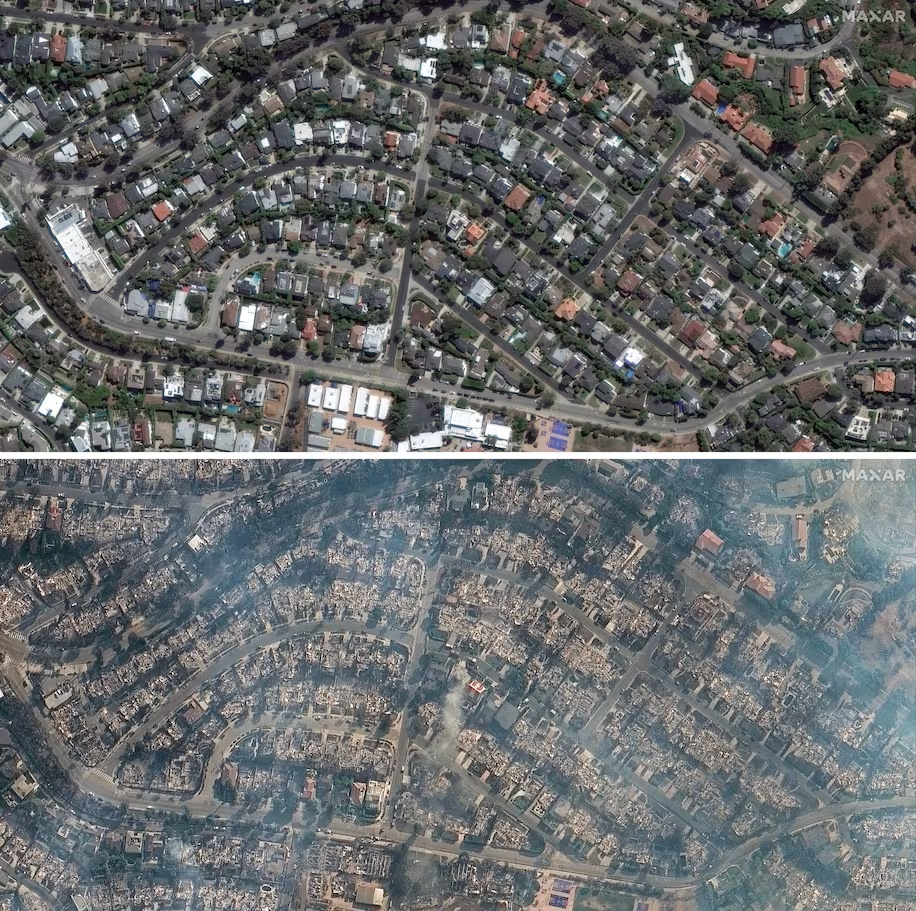 El proveedor de imágenes satelitales Maxar Technologies ha proporcionado nuevas fotos que muestran el alcance de la destrucción causada por los devastadores incendios forestales que están azotando el sur de California.