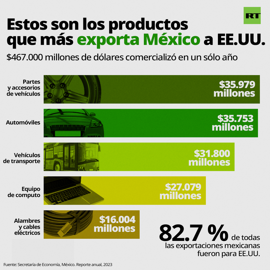 - Igualmente, destaca la industria alimentaria, una de las que más podría golpear a los consumidores estadounidenses, al tener un aumento considerable producto de los aranceles. En 2023, entre frutas y vegetales se exportaron 12.000 millones de dólares. Un sector clave para México, que además sobresale por ser el primer productor mundial de aguacate, un alimento que se encuentra regularmente en los anaqueles estadounidenses. Y en los últimos años las ventas han aumentado considerablemente.
