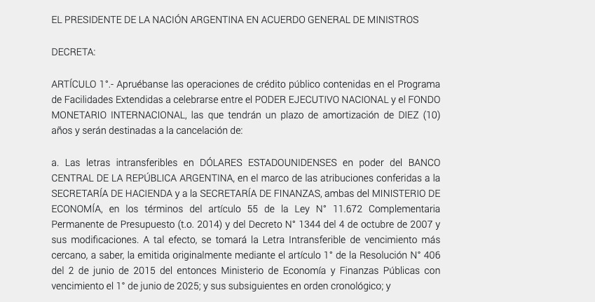 "Apruébanse las operaciones de crédito público contenidas en el Programa de Facilidades Extendidas a celebrarse entre el Poder Ejecutivo Nacional y el Fondo Monetario Internacional que tendrán un plazo de amortización de diez años", señala el decreto que fue publicado en el Boletín Oficial.
