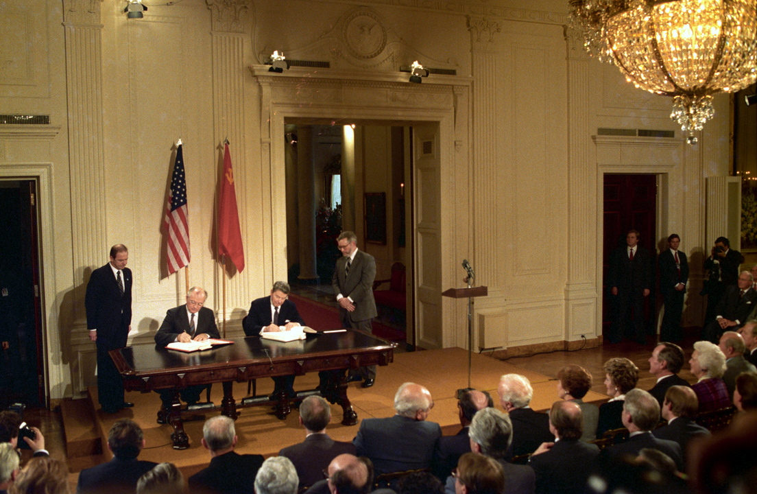 En 1987, el secretario general Mijaíl Gorbachov y el presidente Ronald Reagan firmaron el Tratado sobre la eliminación de misiles de alcance medio y corto (INF), que puso fin a la crisis de los euromisiles, vinculada al despliegue de misiles balísticos de alcance medio por parte de la OTAN y del Pacto de Varsovia en Europa.