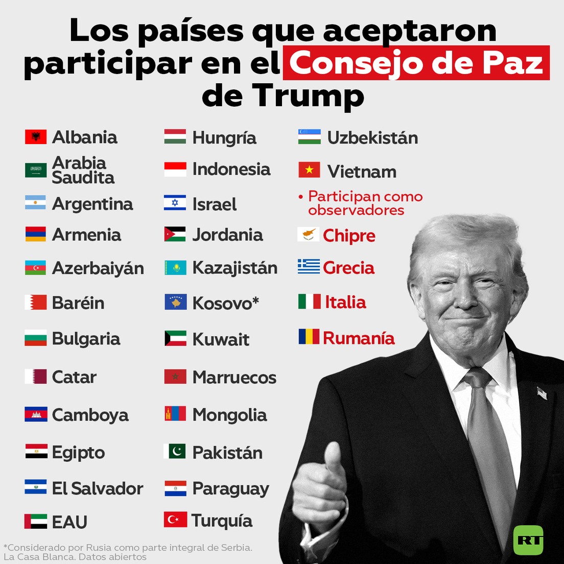El presidente ruso, Vladímir Putin, agradeció a Trump la invitación al Consejo de Paz y encomendó al Ministerio de Relaciones Exteriores que estudie los documentos recibidos para dar una respuesta. Asimismo, indicó que Moscú está dispuesto a donar al organismo 1.000 millones de dólares de activos rusos, congelados en EE.UU. por decisión de la anterior Administración.