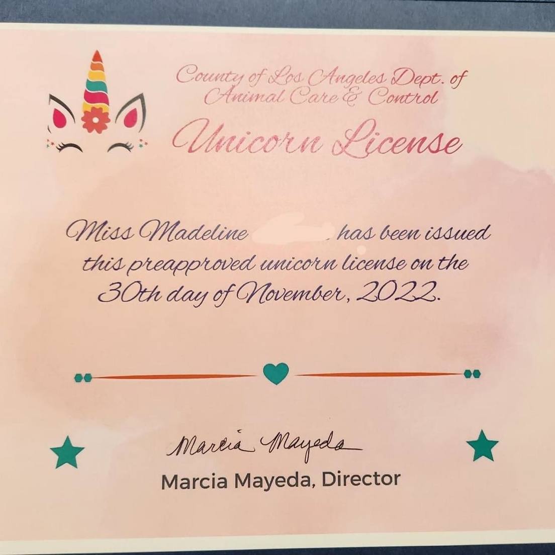 El Departamento de Control y Cuidado de Animales del condado de Los Ángeles (EE.UU.) autorizó a una pequeña niña a tener en casa como mascota un unicornio, en caso de que lo consiga, y le otorgó una licencia permanente en respuesta a la tierna carta en la que solicitó la aprobación oficial.