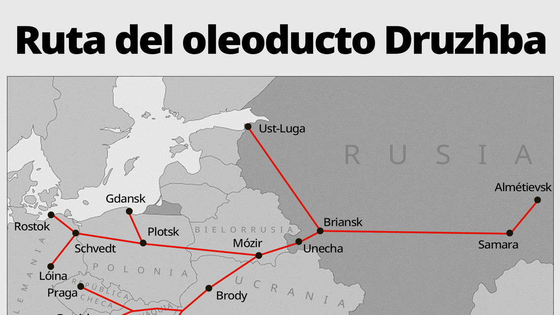 La rama sur del oleoducto Druzhba, que atraviesa Ucrania, transporta crudo ruso hacia Hungría y Eslovaquia, mientras que el ramal norte, que abastecía a Polonia y Alemania, fue cerrado por las sanciones europeas.